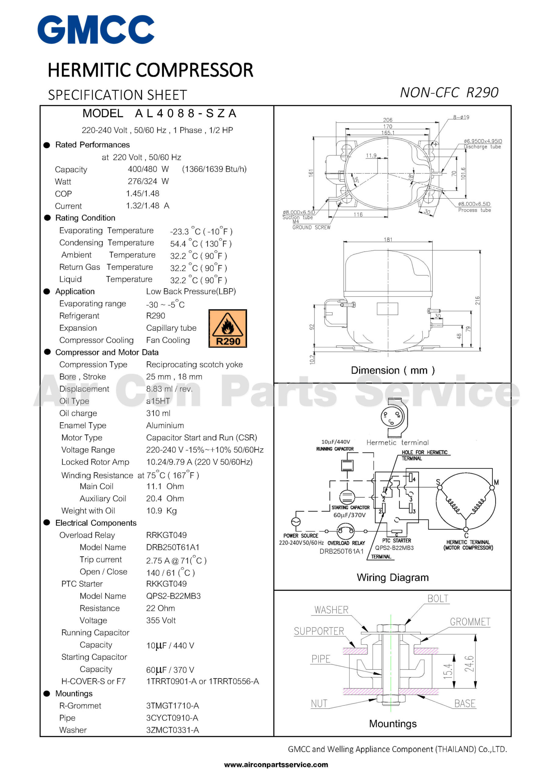 คอมเพรสเซอร์ตู้แช่ GMCC รุ่น AL4088-SZA