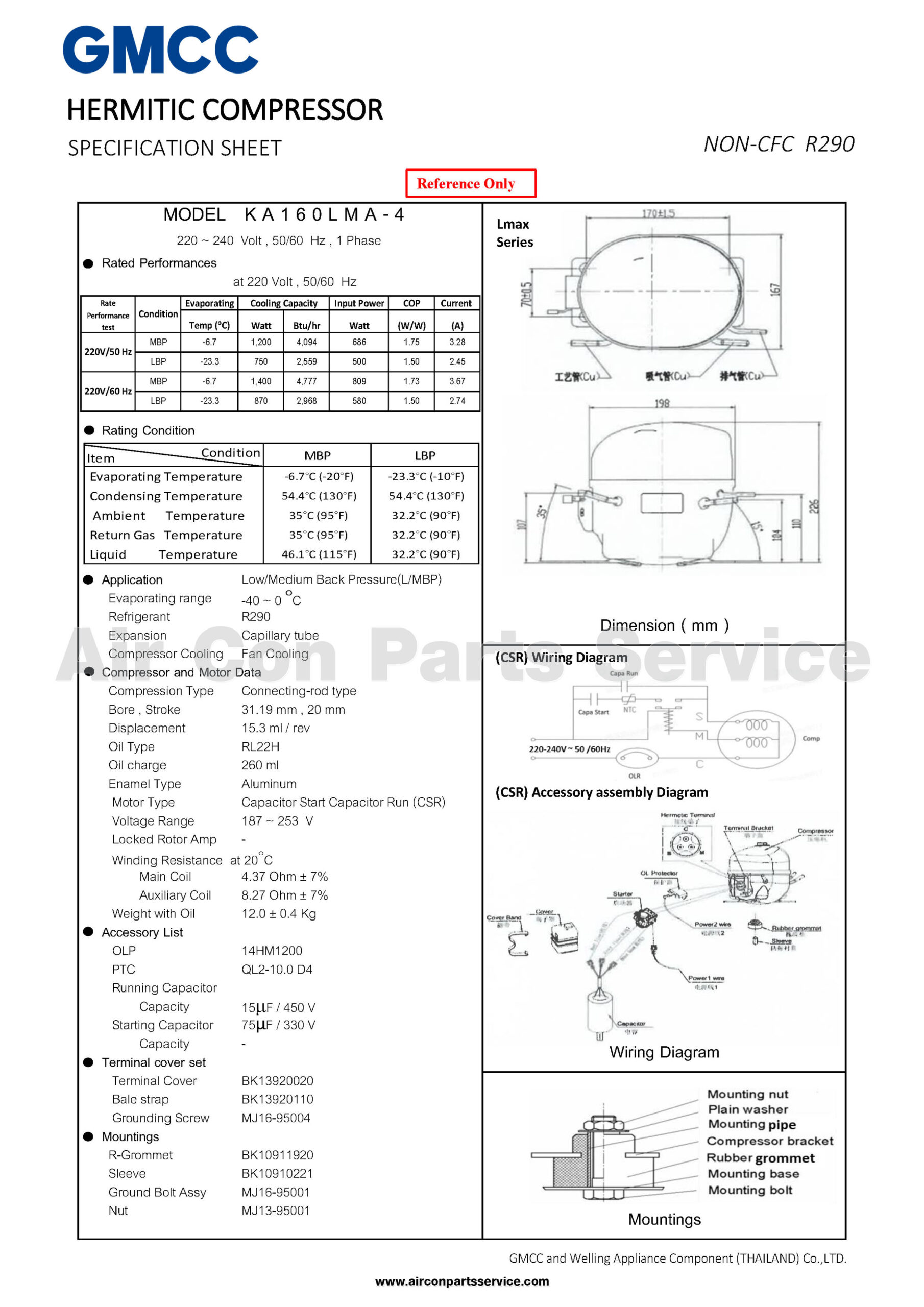 *สามารถใช้ทดแทนได้กับคอมเพรสเซอร์ KULTHORN รุ่น AE2425N, AE9445N, AE7440EK (R22), BA7440E (R22)